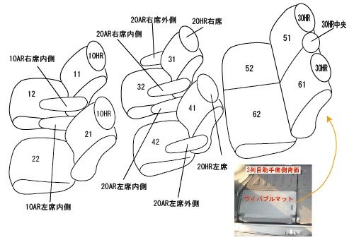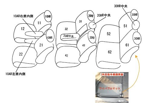 オプションマット類(純正シートに直接固定するタイプのマット等はカバー装着後、装着できなくなる恐れがあります。) オプション 2列目用USBチャージャー 2列目シートアンダーボックス(オプション) 3列目助手席側背面ワイパブルマット無し車 |